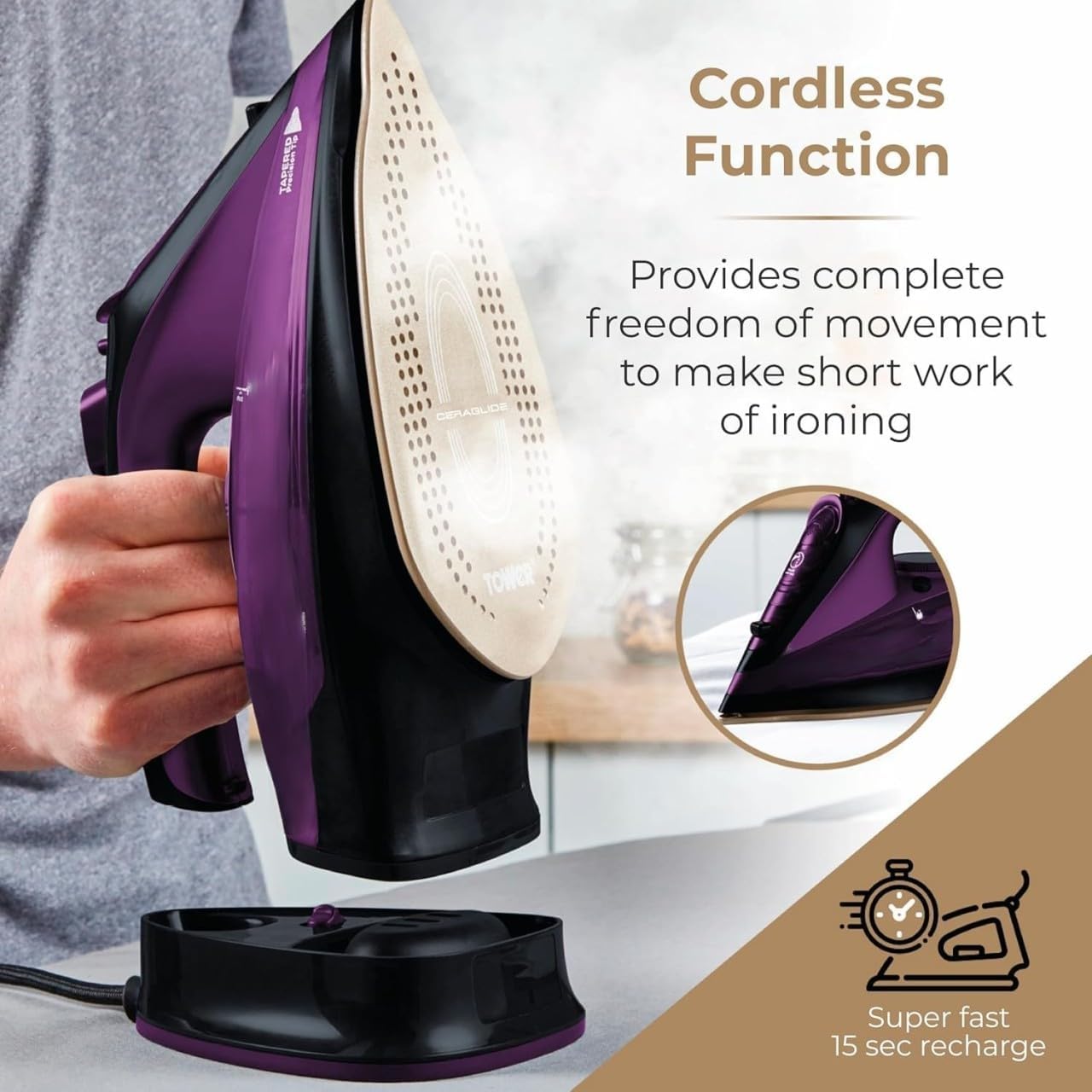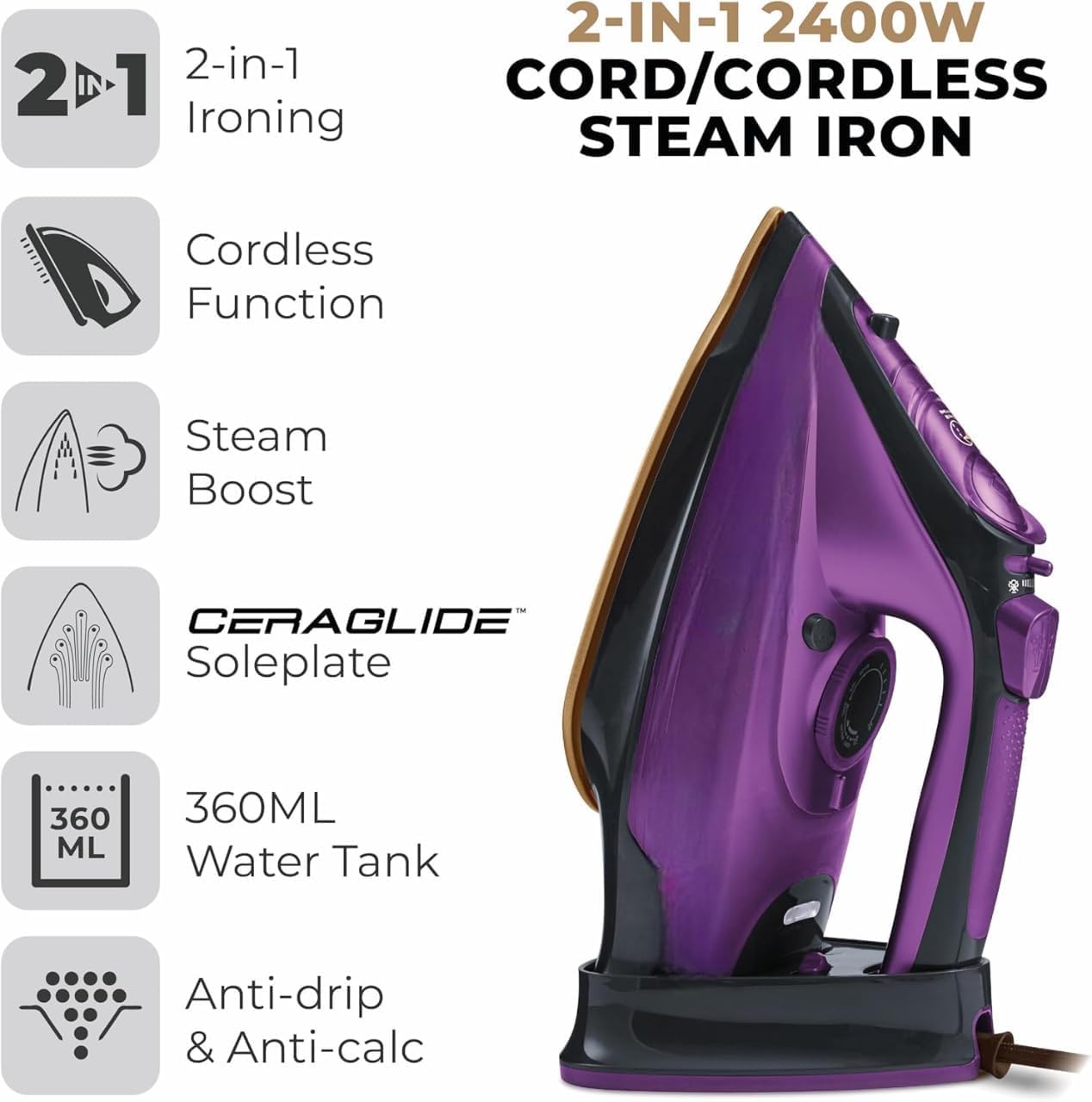 Elevate Your Ironing Experience: 2400W Cordless Freedom & Professional Power Tired of fighting with tangled cords and restricted movement? Experience the future of garment care with our 2400W Cordless Steam Iron. Designed for the modern home, this elegant purple iron combines the heavy-duty pressing power of a professional appliance with the lightweight portability of a handheld steamer. Why Choose Our Cordless Ceramic Steam Iron? Ultimate Movement: Cord-Free Ironing Say goodbye to the “cord-tangle” dance. Our wireless charging base allows you to pick up the iron, press your clothes from any angle, and set it back down to reheat in seconds. Perfect for large items like bedsheets or curtains where a cord would usually get in the way. Professional 2400W High-Heat Output Don’t let the “cordless” label fool you. With 2400W of power, this iron heats up rapidly and maintains consistent steam pressure. It’s tough enough for thick denim and linen, yet precise enough for your most delicate silks. Advanced 5-Speed Fabric Protection Every fabric is different. Our 5-speed adjustment system allows you to dial in the exact temperature and steam flow needed. From low-heat synthetics to high-steam cotton settings, you’ll never have to worry about scorching or sticking again. Smooth-Glide Ceramic Soleplate Our premium ceramic bottom plate is engineered for a friction-free glide. It’s scratch-resistant, easy to clean, and distributes heat more evenly than standard stainless steel, ensuring a crisp, professional finish every time. Vertical & Horizontal 2-in-1 Versatility Use it as a traditional flat iron on an ironing board, or switch to Vertical Steam Mode to refresh hanging suits, dresses, or heavy drapes. The detachable water tank makes it easy to refill at the sink without bringing the whole unit with you. Technical Specifications & Features: Power: 2400W High-Efficiency Heating Soleplate: Non-Stick Advanced Ceramic Settings: 5-Speed Variable Temperature Control Maintenance: Self-Cleaning & Anti-Calc System Safety: Anti-Drip Technology (No water spotting) Color: Elegant Deep Purple