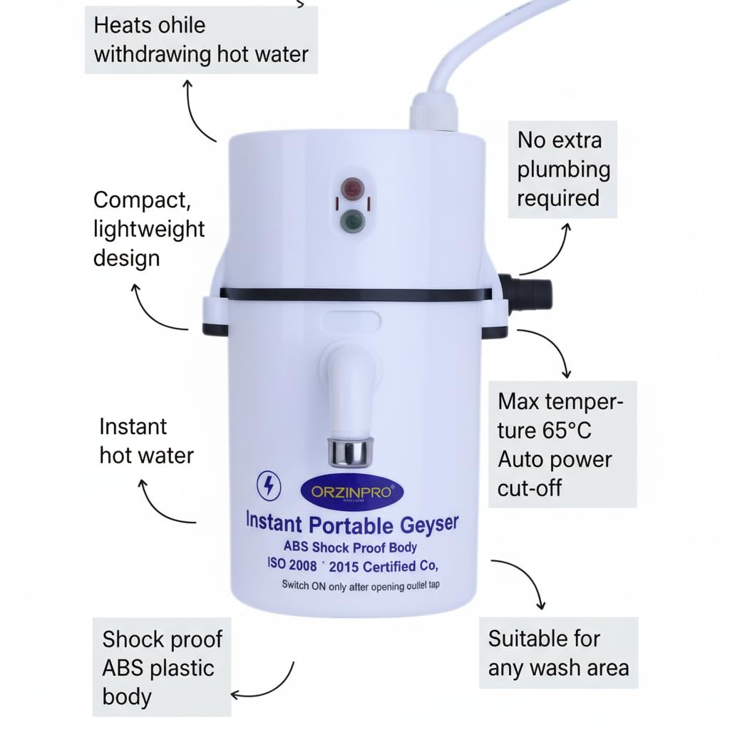 ** Instant Hot Water in Seconds:** ORZINPRO Auto Cut-Off Instant Water Heater delivers hot water instantly — no waiting, no storage tank needed. Perfect for bathrooms, kitchens, salons, offices & travel use.