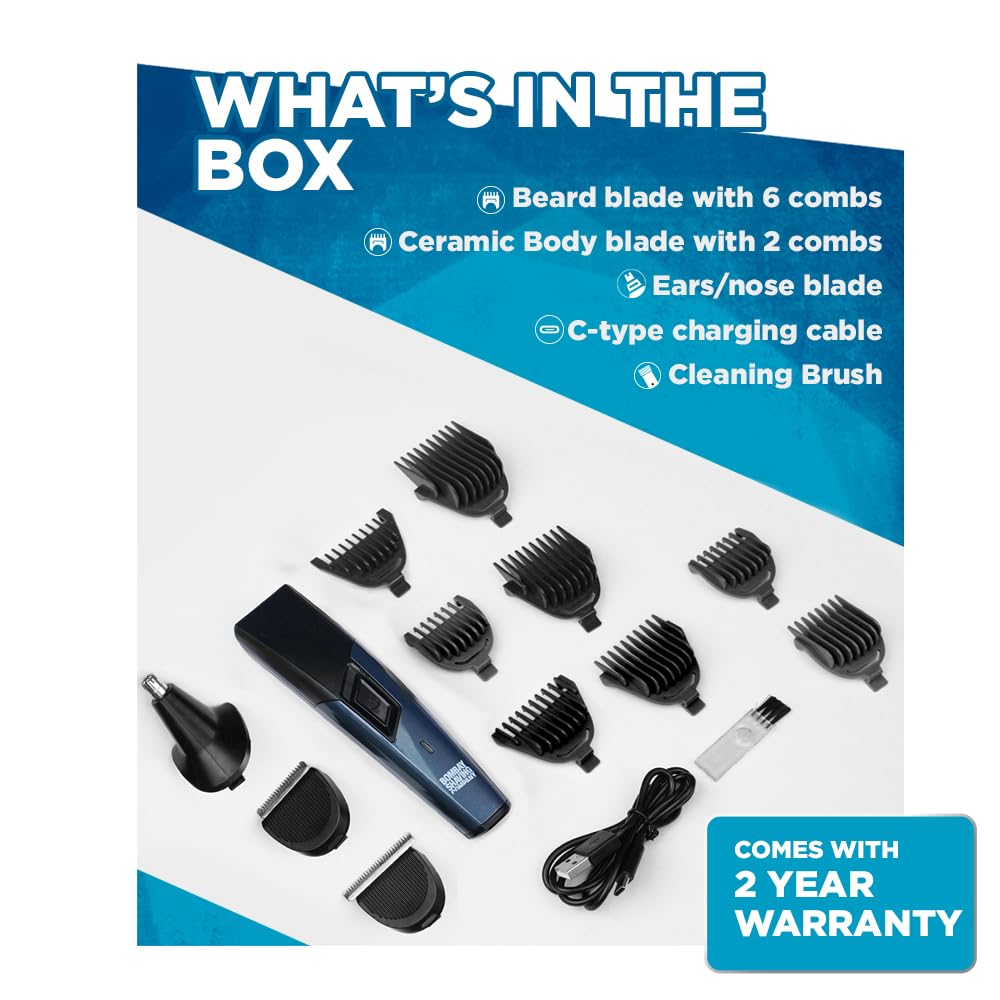 Bombay Shaving Company 11 In 1 Trimmer Men|All In One Full Body Trimmer|90 Min Charge Time|90 Mins Run Time|Hair, Ear, Beard, Body, Nose Trimme|Type C Charging|Power Groomer (New Model),Blue