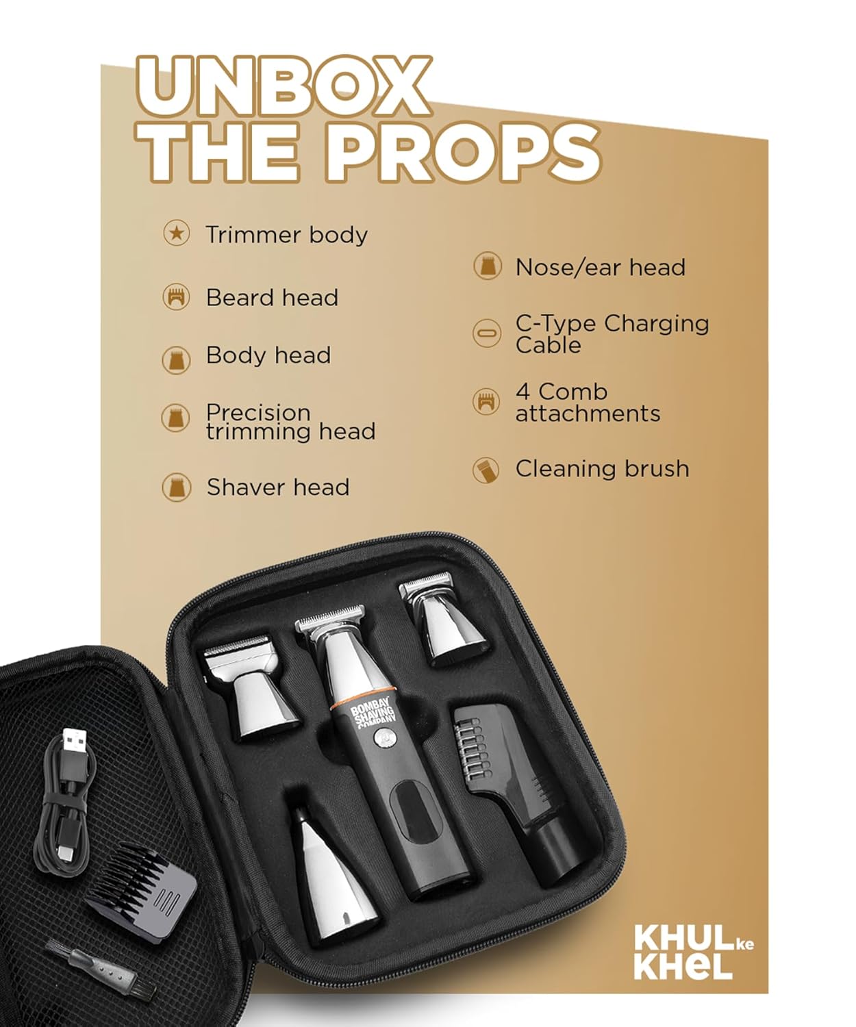 Generic Name : Bombay Shaving Company Full Body Trimmer Limited Edition With Hard Travel Case | 5 Magnetic Attachments, Multi Length Settings Comb, Detachable Blades, Type C Flash Charging, IPX6 Waterproof | Multi-grooming Trimmer | Travel Trimmer Case | Gifts For Men