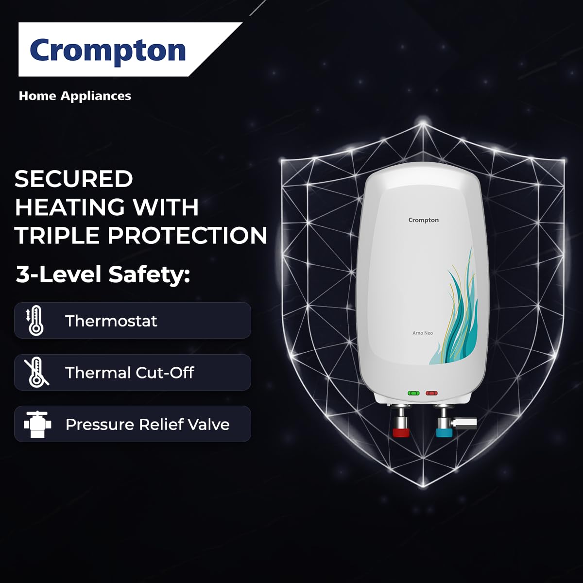 Crompton Arno Neo 3 Litres instant water heater (Geyser) with 3 Level Advance Safety and Food grade technology|Rust proof Body | 5 years tank warranty | 2 years element warranty