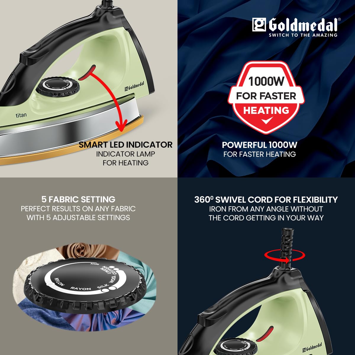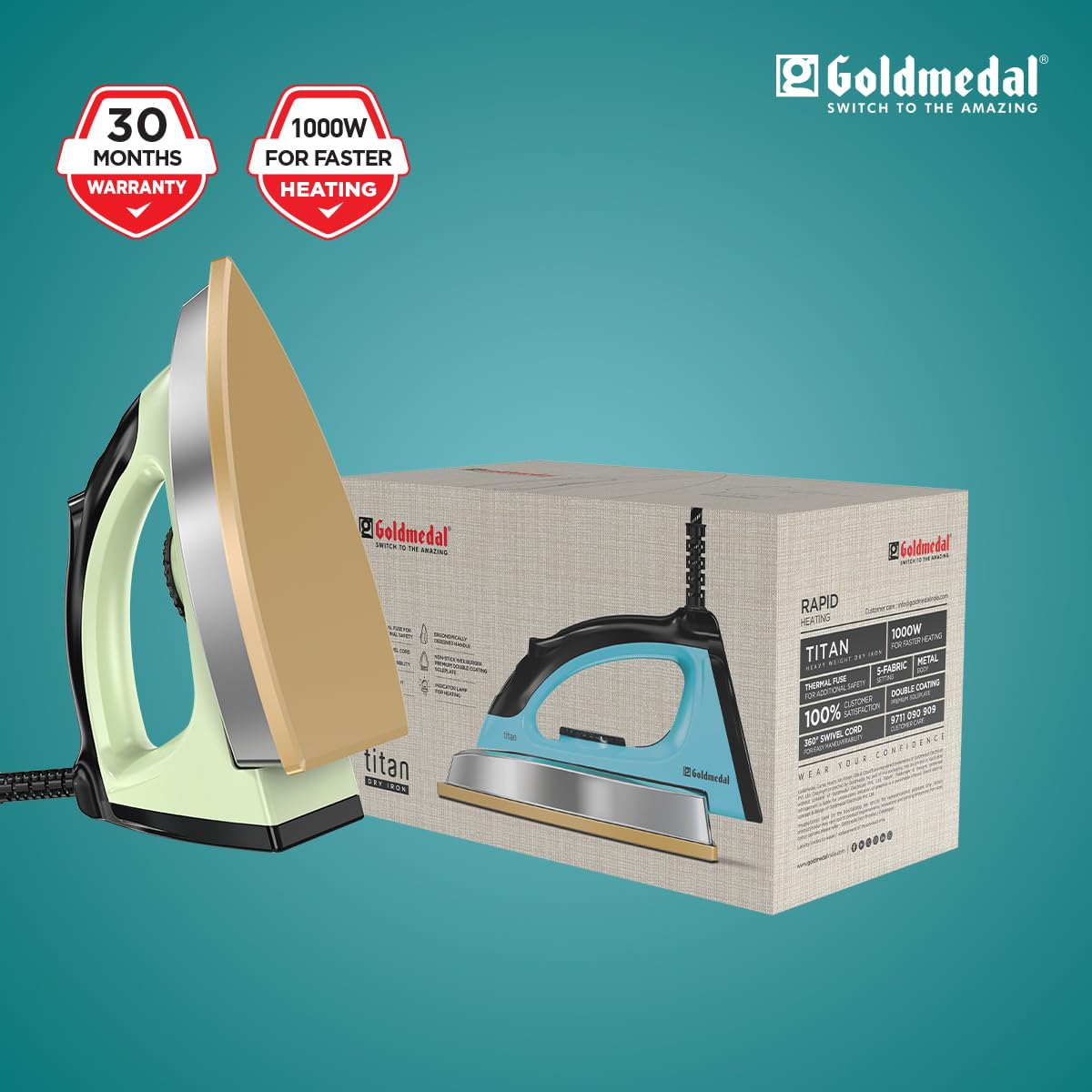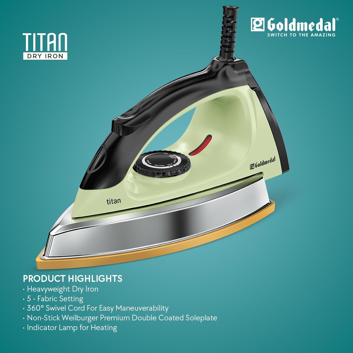 Goldmedal Titan 1000W Dry Iron| Non-stick Weilburger Premium Double Coated Soleplate| 5 Fabric Setting|1.8 Meter Cord| 360° Swivel Cord| 2.5 Years Warranty| 1.5KG Heavy Weight (Mint Green)