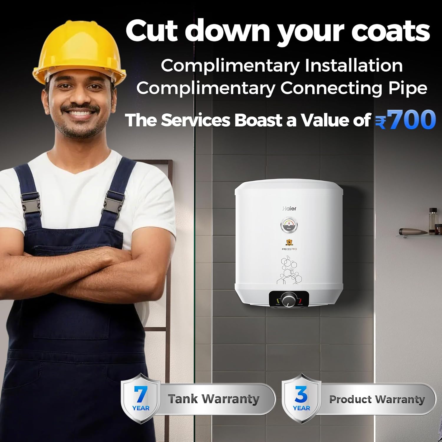 Free Installation: We offer free door-to-door installation for the storage water heater with installation—this 15 ltr geyser is covered even in remote areas. As a top-tier water geyser 5 star model and a reliable haier 15 ltr water geyser, however, additional auxiliary materials (such as extra pipes needed if the existing ones are too short) must be purchased by the customer and are not included in the installation service. Once you receive your product, simply call the number on the package to schedule a free installation by our expert engineers. Plus, we offer a 3+7 year warranty—3 years on the product and 7 years on the inner tank