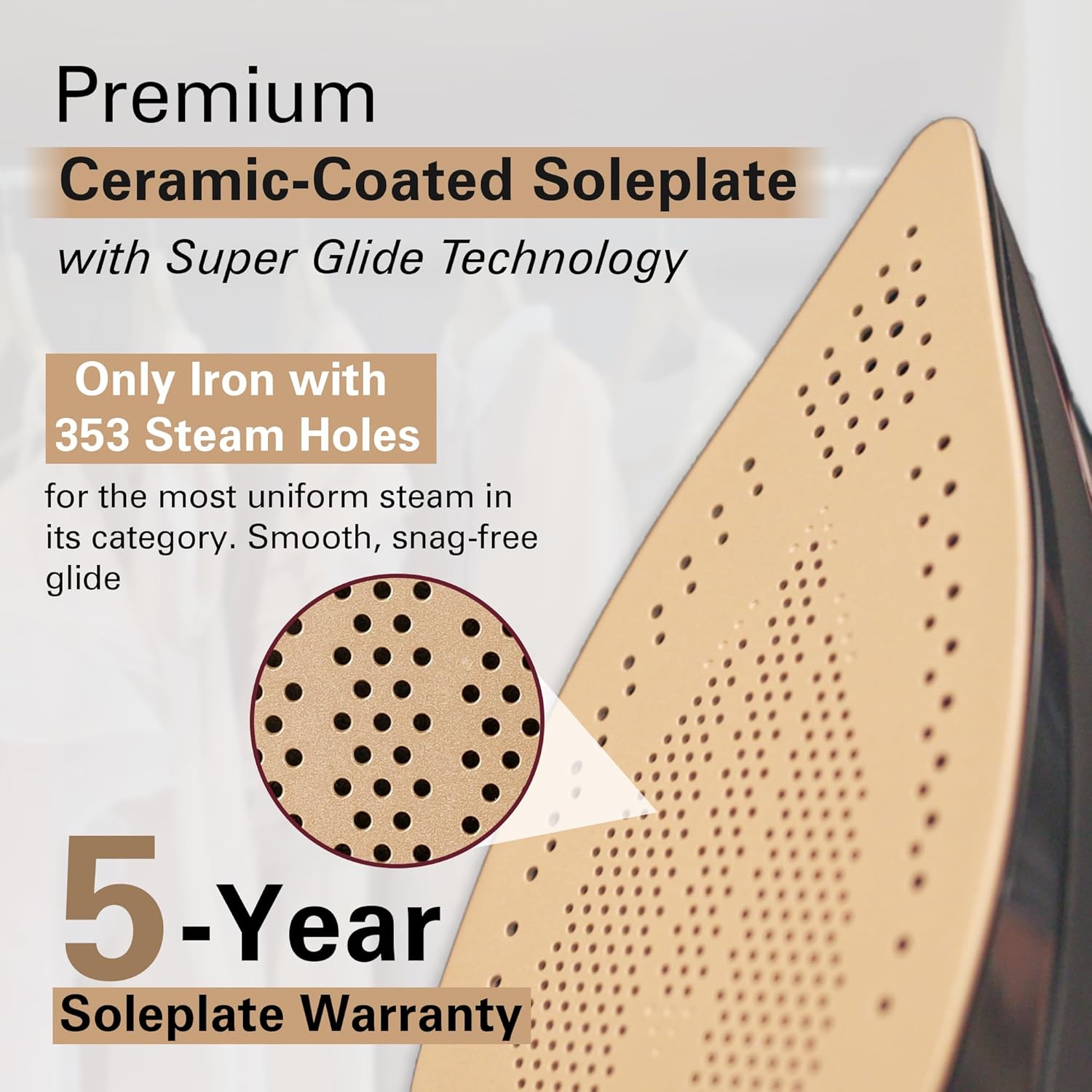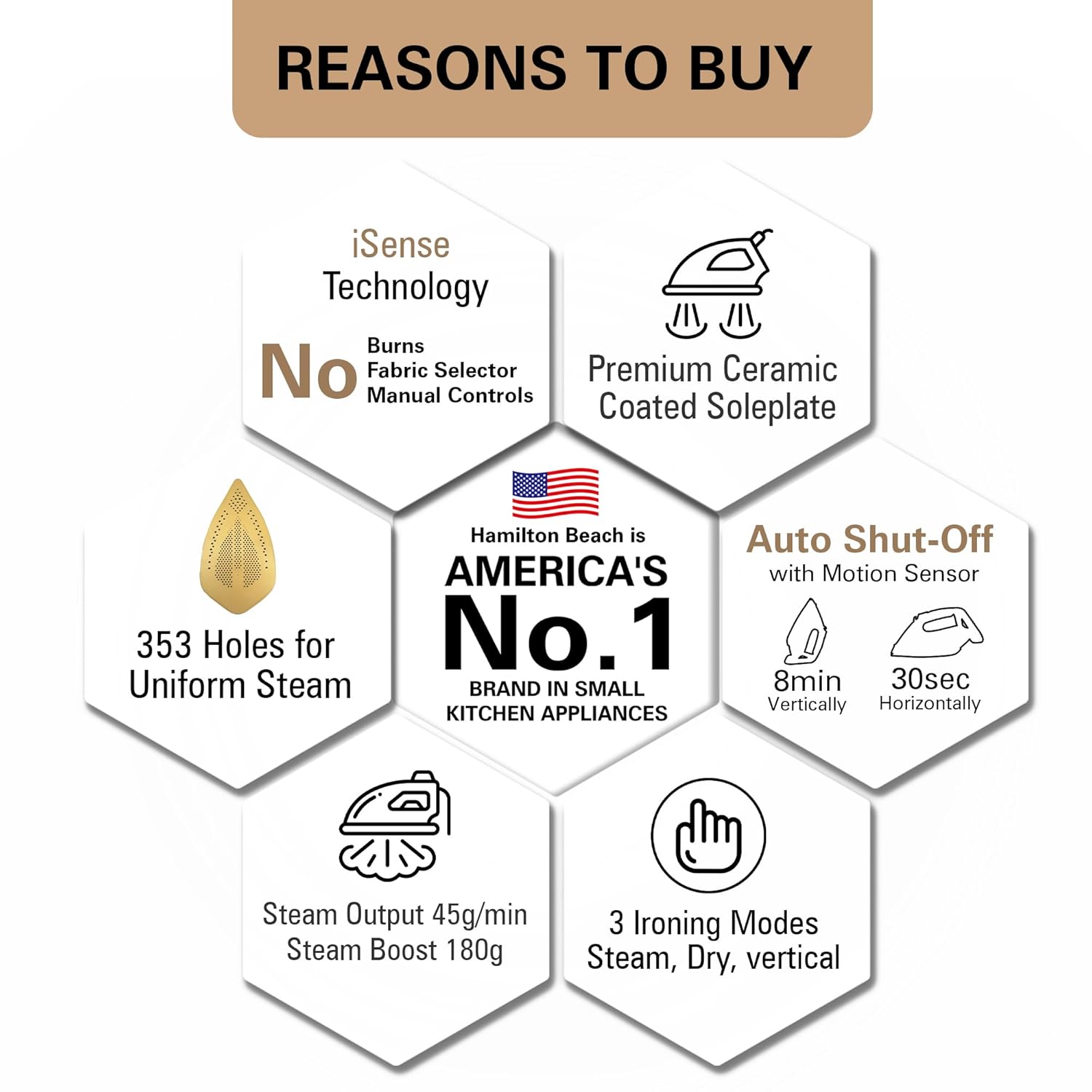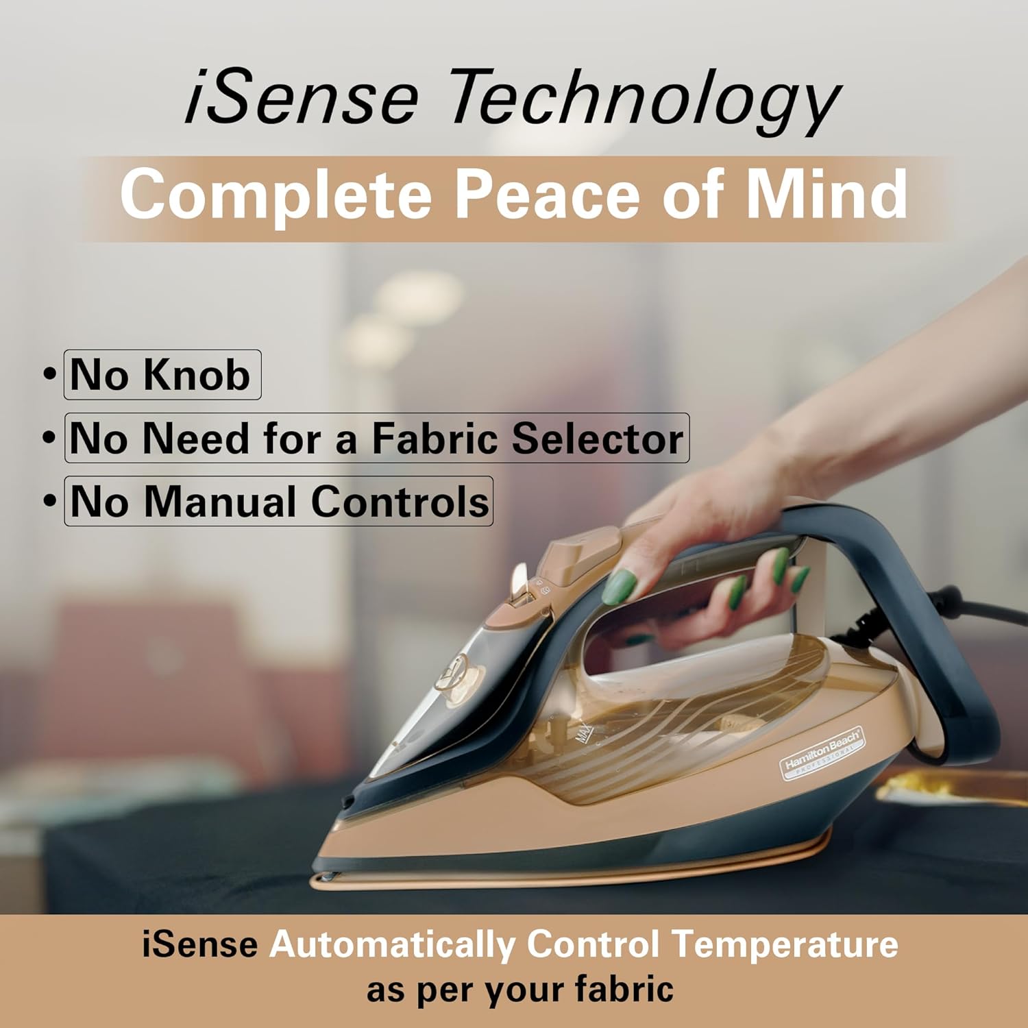Hamilton Beach Fully-Automatic Steam Iron with iSense Technology, Steam Iron, Intelligent Auto-Temp, iron for clothes, Ceramic-Coated Soleplate with 5-Year Warranty, Auto Standby, 45g/min Steam, Gold