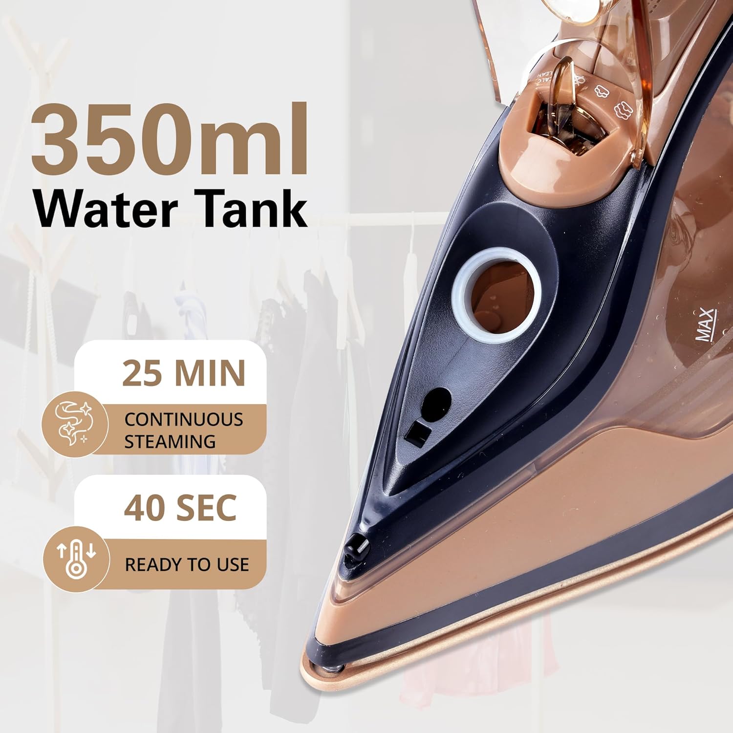350ml Large Tank = Iron More, Refill Less: This steam iron comes with a 350ml water tank, allowing you to press more garments in one go. Ideal for daily loads, family ironing, and longer sessions. perfect iron for clothes of all types.