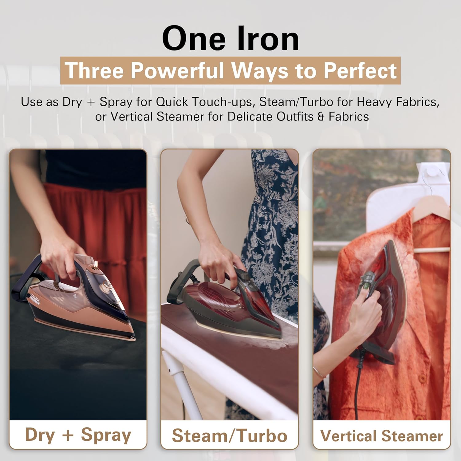 High Steam Output for Faster, Deeper Wrinkle Removal: This steam iron delivers a powerful 45g/min continuous steam and a 180g turbo steam burst—perfect for thick fabrics like denim and cotton. With 353 steam holes in the ceramic soleplate, this iron box steam iron penetrates deep into every fiber to smooth tough wrinkles quickly.