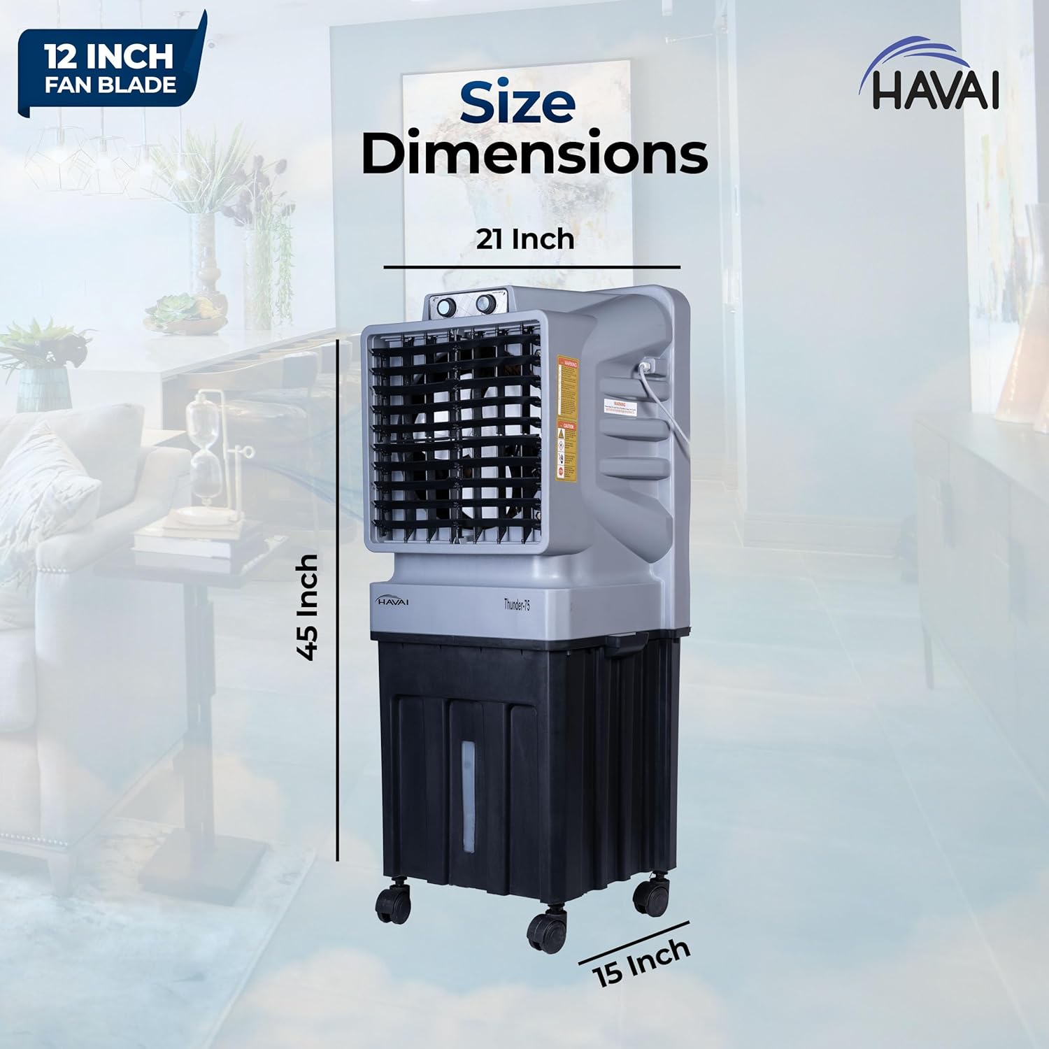 The HAVAI Thunder 75 Desert Air Cooler (Black & Grey Dual Tone) is a powerful and reliable cooling solution designed for both home and commercial environments. Built with a strong structure and efficient cooling technology, this model ensures long-lasting performance even during peak summer conditions. With its 75-litre water tank, the cooler provides extended cooling hours without frequent refilling. The 16-inch heavy-duty fan delivers strong airflow, while the 3-side honeycomb cooling pads enhance water retention and cooling efficiency, ensuring faster and more uniform air circulation. The auto swing function helps distribute cool air evenly throughout the room, making it suitable for living rooms, halls, shops, offices, workshops, and semi-open areas. The cooler is mounted on sturdy castor wheels, allowing easy movement and flexible placement. Its premium dual-tone black & grey finish adds a modern and professional appearance, making it suitable for both residential and commercial interiors. For customer peace of mind, the product comes with a 1-year warranty on the main motor. In case of any issue during the warranty period, customers can contact the support team and assistance will be provided within 48 hours. Even after the warranty period, post-warranty service support is available, with customers only paying for the required spare parts. To ensure long life and consistent performance, users are advised to clean the honeycomb pads and cooler regularly, as regular maintenance significantly improves cooling efficiency and product durability. The HAVAI Thunder 75 is a dependable, high-performance desert cooler designed to deliver powerful airflow, durability, and convenience — making it an ideal choice for both household and professional use.