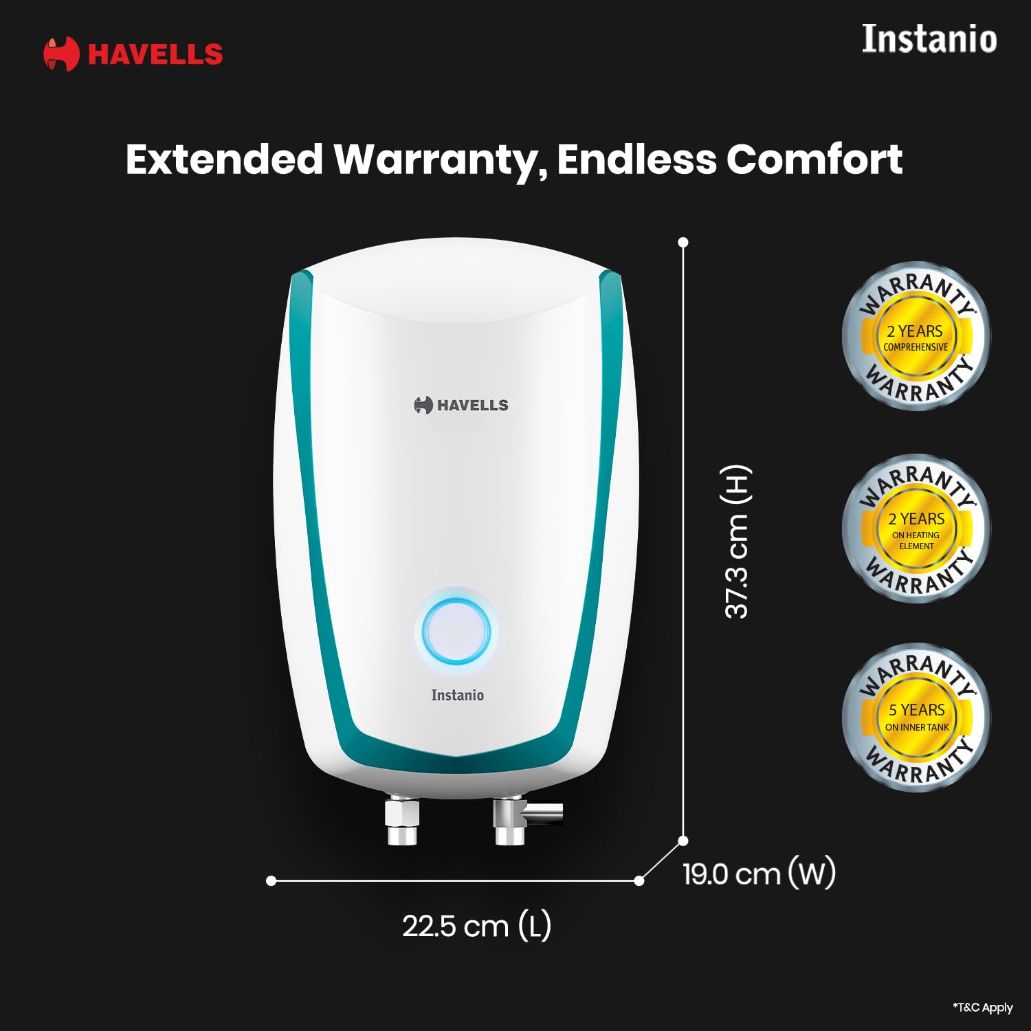 Havells Instanio 3L Instant Water Heater(Geyser)| Temp. Sensing LED Indicator| Rust & Shock Proof Body| ISI Marked|Warranty: 5 year on Inner Tank| High Rise Compatible (White Blue)