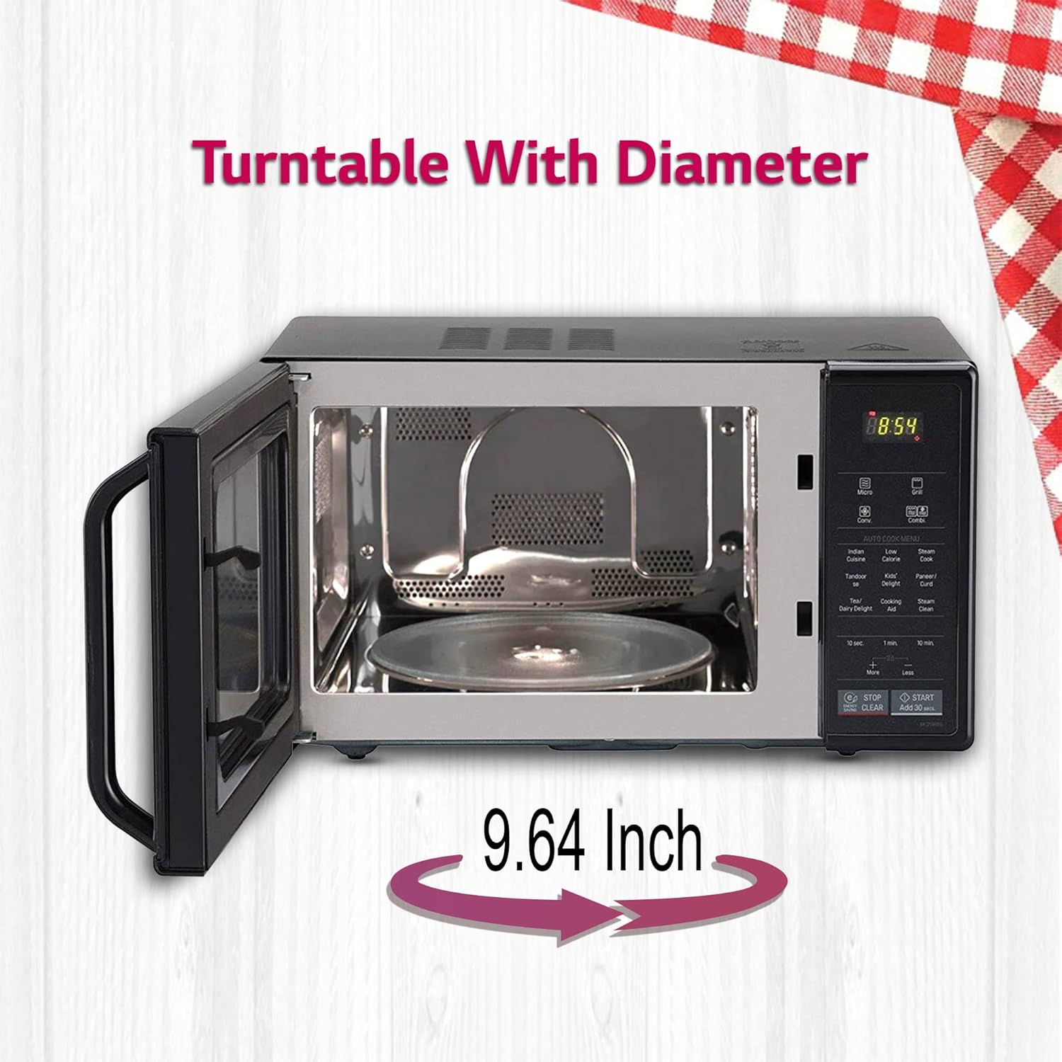 Name of Program & Panel details: Micro, Grill, Convection, and Combination | Auto Cook Menu: Indian Cuisine, Low Calorie, Steam Cook, Tandoor Se, Kids Delight, Paneer/Curd, Tea/Dairy Delight, Cooking Aid, Steam Clean | More/Less – Used to increase/decrease the cooking time, STOP/CLEAR (ENERGY SAVING): Used to stop oven and clear all entries. For setting energy saving feature., START/+30 seconds