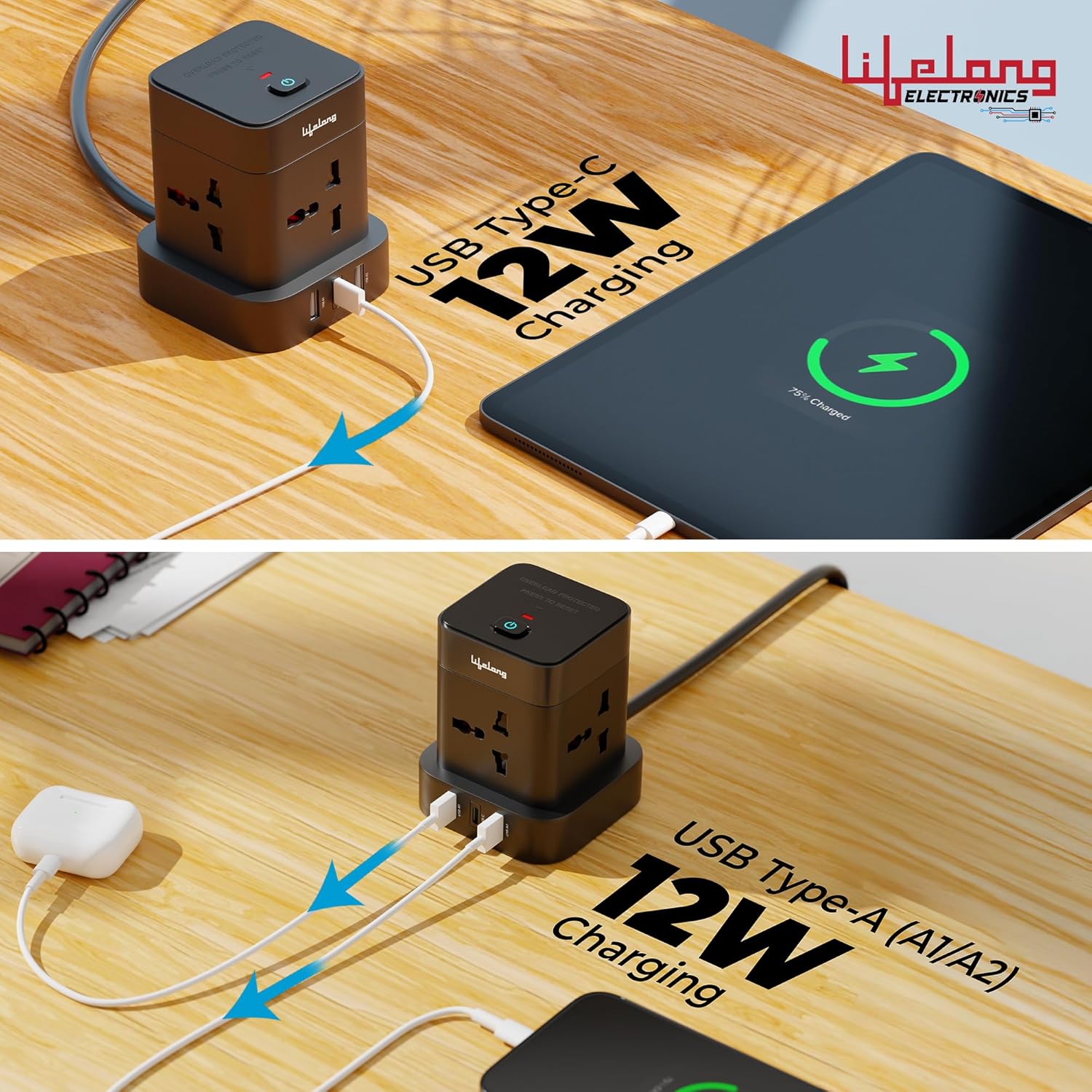 Lifelong Electronics Extension Board 7-in-1 with Switch | 4 AC Sockets + 3 USB Ports (2 Type A + 1 Type C) | Overload Protection | Desk Accessories & Multiplug Gadget | 2M Cord (Model: Cube)