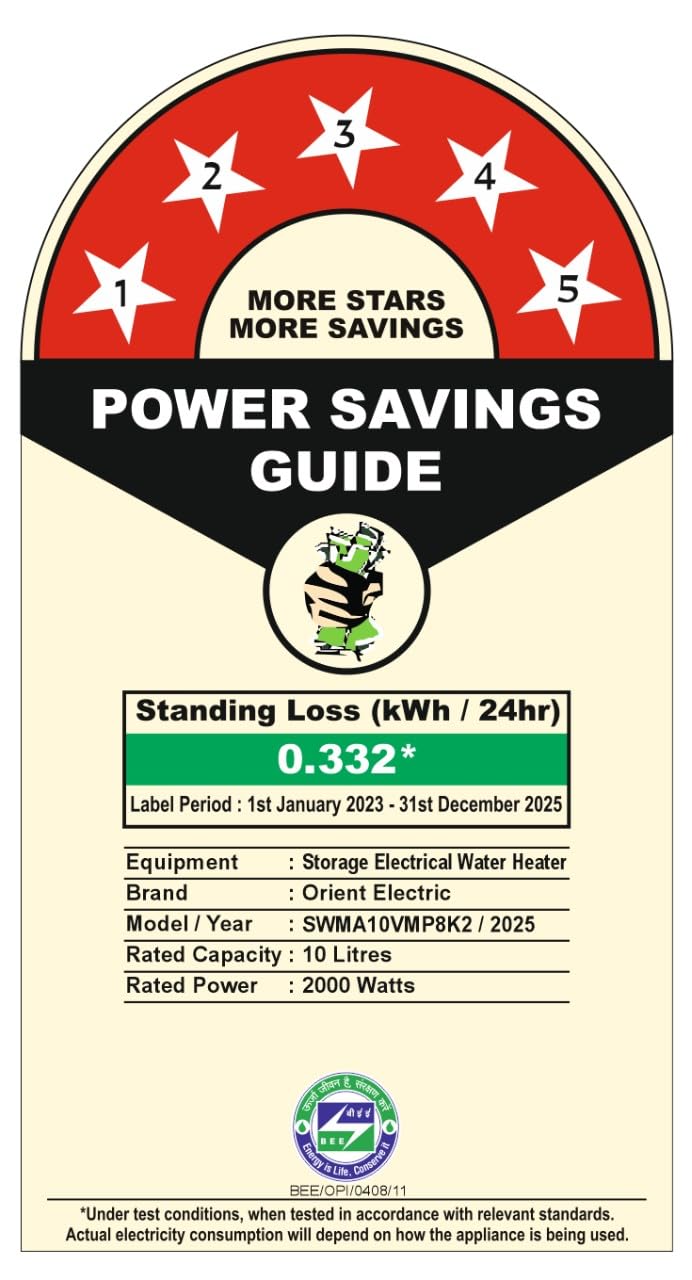 BEE CERTIFIED 5-STAR EFFICIENCY – Engineered to deliver hot water faster while consuming less energy. BEE Label Period-1st Jan, 2023 to 31st Dec, 2025.