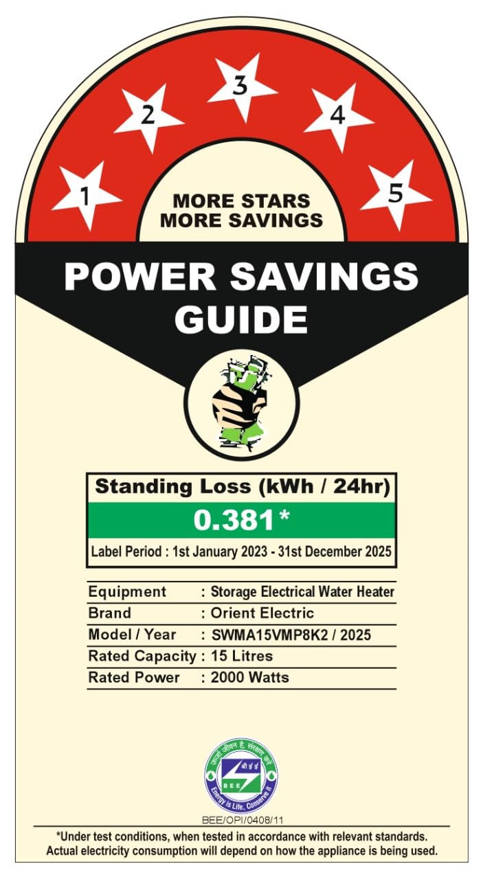 BEE CERTIFIED 5-STAR EFFICIENCY – Engineered to deliver hot water faster while consuming less energy. BEE Label Period-1st Jan, 2023 to 31st Dec, 2025.