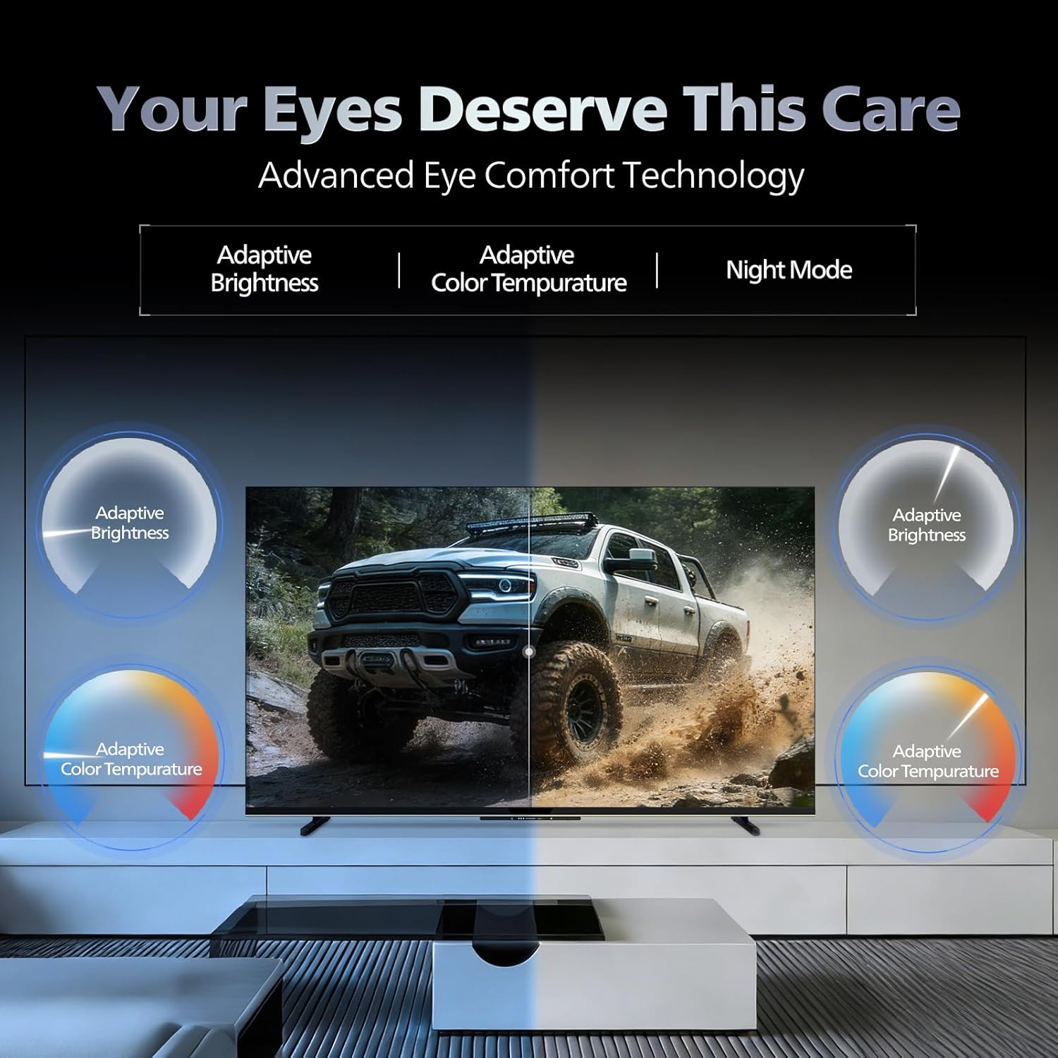 Adaptive brightness automatically adjusts to your room lighting for comfortable viewing. Ambient Mode blends visuals with your surroundings for a more natural, relaxed experience.