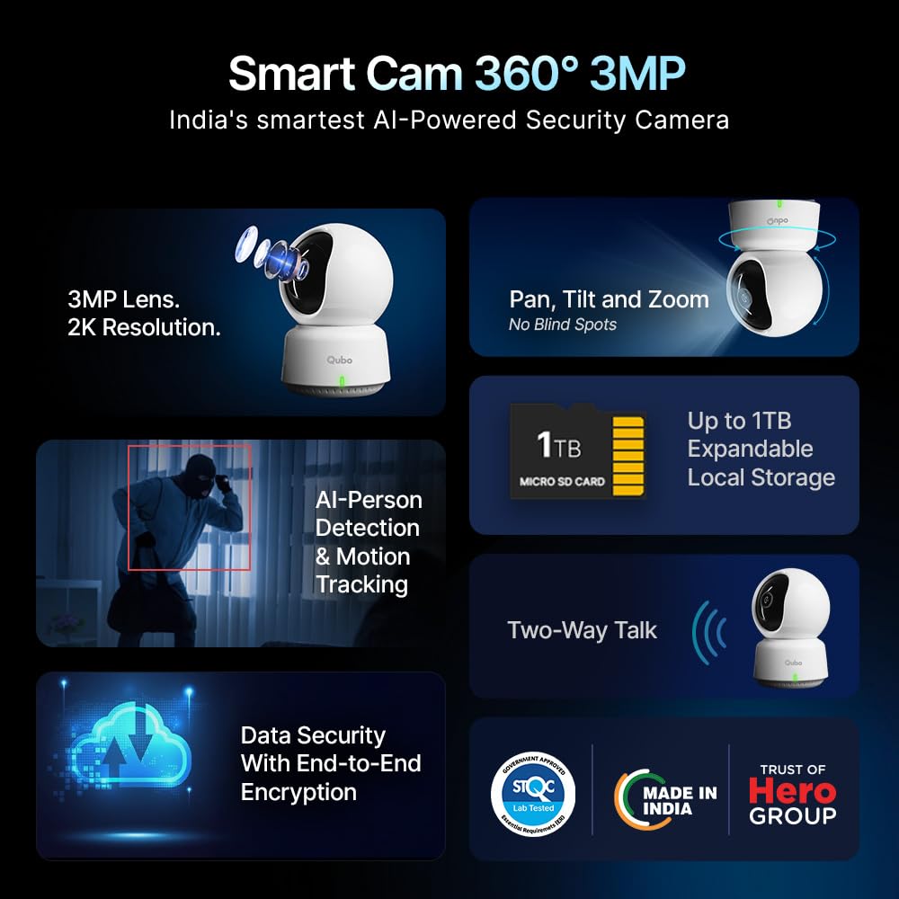 Qubo Smart 360° 3MP [2K] Wi-Fi Security Camera [2026 Edition] by Hero Group | Indoor CCTV Cam for Home | AI Person Detection | Auto-Alarm | NightPulse Vision | SD&Cloud Storage (Pack of 2)