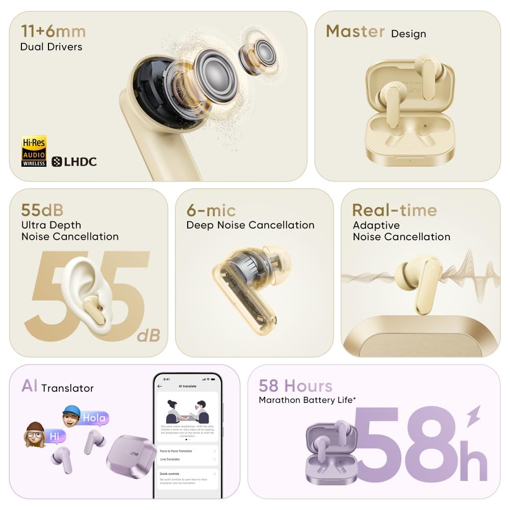 Elite 55dB Active Noise Cancellation (ANC)| Silence the world with industry-leading 55dB Smart ANC. It intelligently detects and cancels up to 99.6% of ambient noise—from humming airplane engines to busy office chatter—so you can focus on what matters.