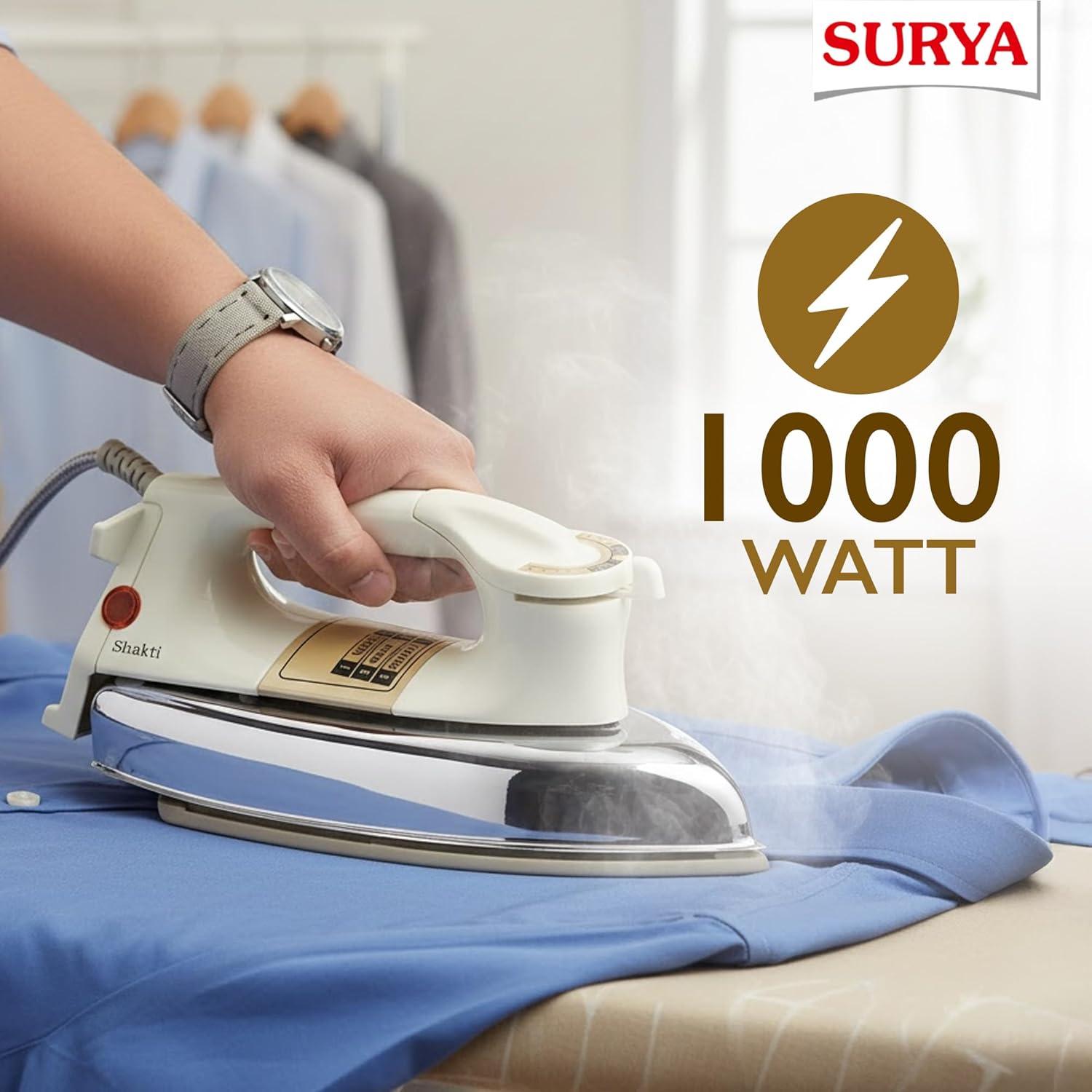 Surya Roshni Shakti Heavy Weight 1000W Dry Iron with Weilburger Double Non-Stick Coating, Germ-Defying Soleplate, Smart Heat Control & 180° Swivel Cord for Smooth and Efficient Ironing
