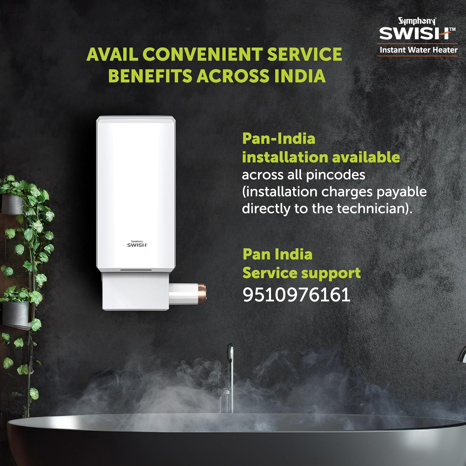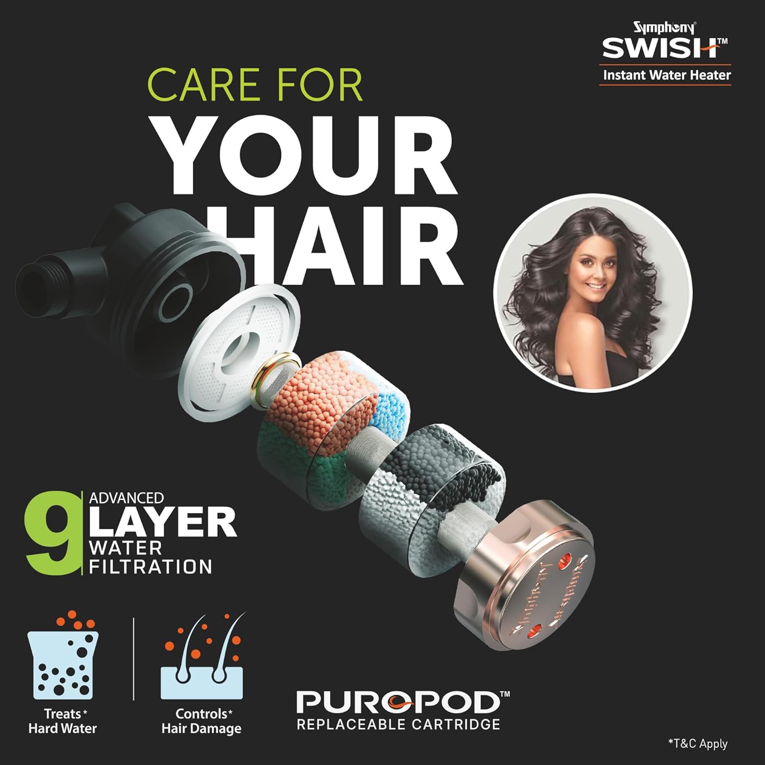 FIRST HAIR FALL CONTROL GEYSER: Symphony Swish is India’s first instant geyser with a 9-layer PUROPOD filtration system. It softens hard water to reduce damage to hair and skin, helping prevent dryness, breakage, and irritation.