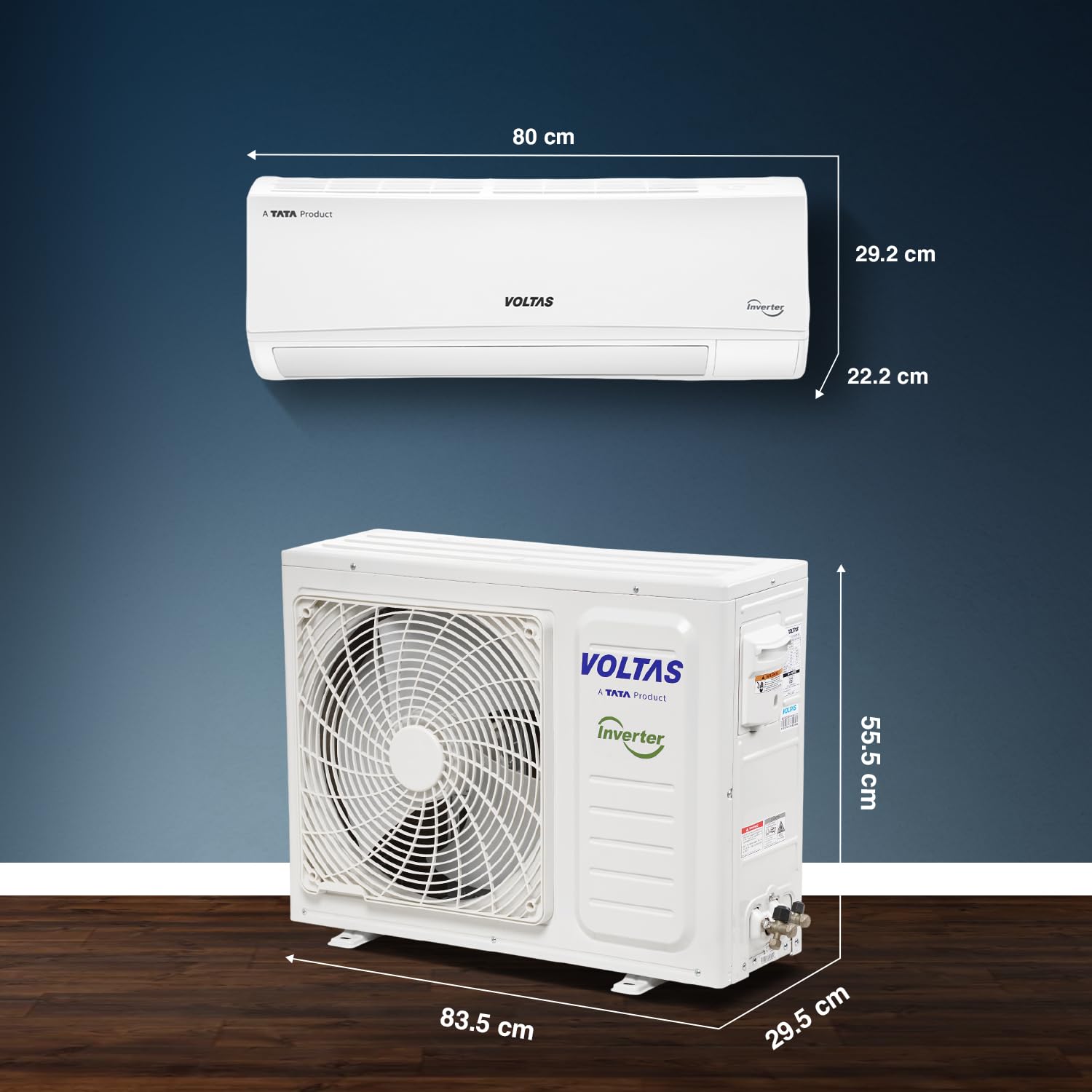 Item Dimensions & Weight : IDU – 80 x 29.2 x 22.2 cm (w x h x d), Outdoor : 83.5 x 55.5 x 29.5 cm (w x h x d), IDU : 9.5 Kg (net weight), Outdoor : 23.7 Kg (net weight)